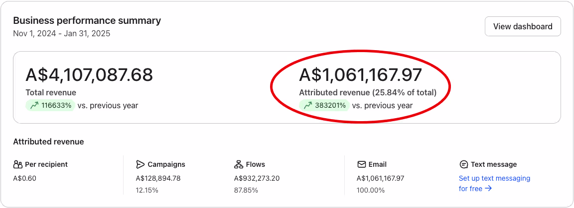 A$1,061,168 in Klaviyo attributed revenue from November 1 to January 31.