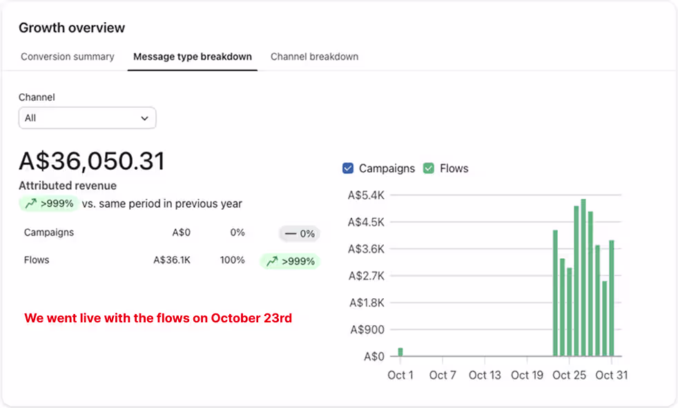 Flows had to come first. They run on every visitor, every abandoned cart, every order, and every shipment without needing manual input after launch.