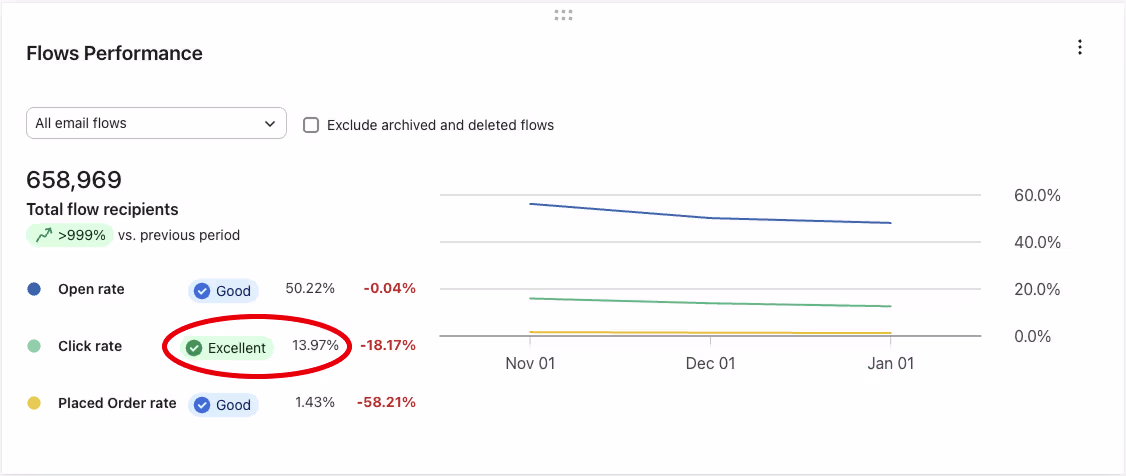 - 14% click rate across all flows = Excellent