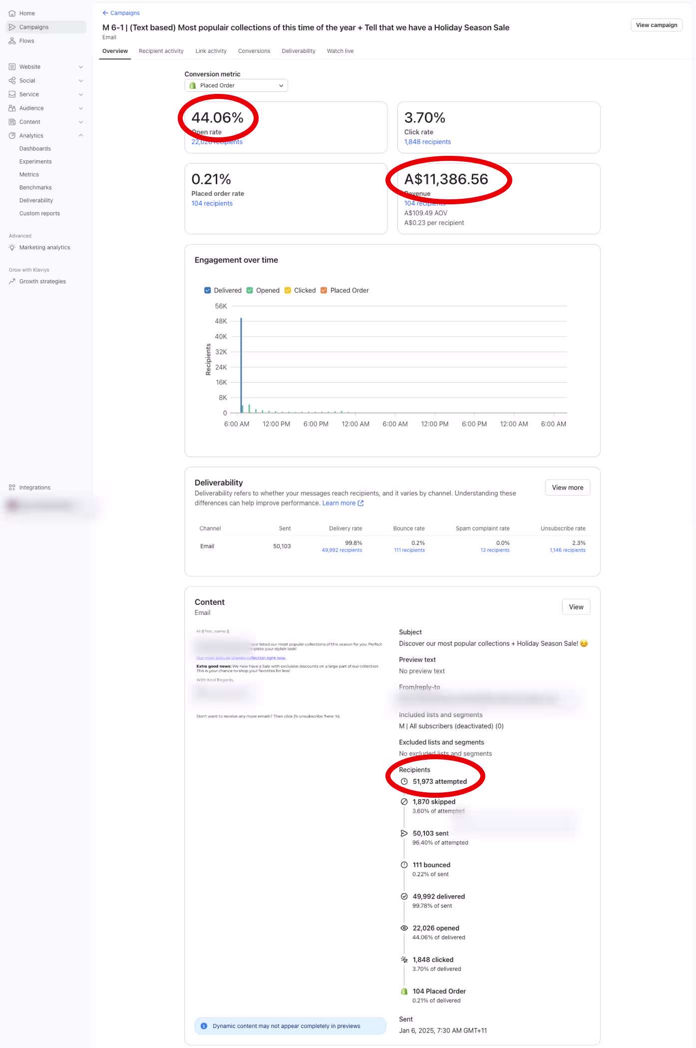 Best campaign send of the window: A$11,386 from a single email to 50,103 recipients on January 6.