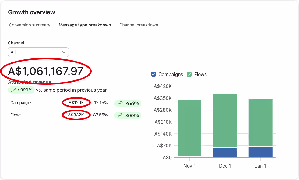 A$1,061,168 in Klaviyo attributed revenue across November–January. A$121,768 from campaigns alone in the 60 days from December through January. A$932,273 from flows running on autopilot.