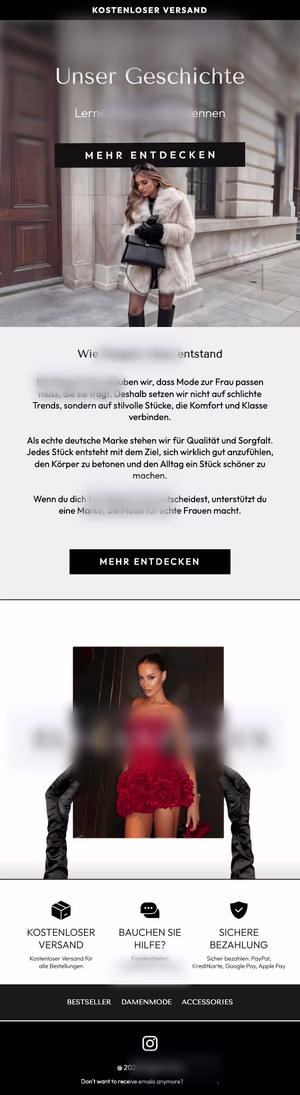 We transitioned the client from our Dropshipping email service to our Brands service. This meant building a completely new email identity: custom branded templates that reflected their fashion positioning, premium copy tailored to their audience, and a strategic content calendar designed around their product range and customer journey.